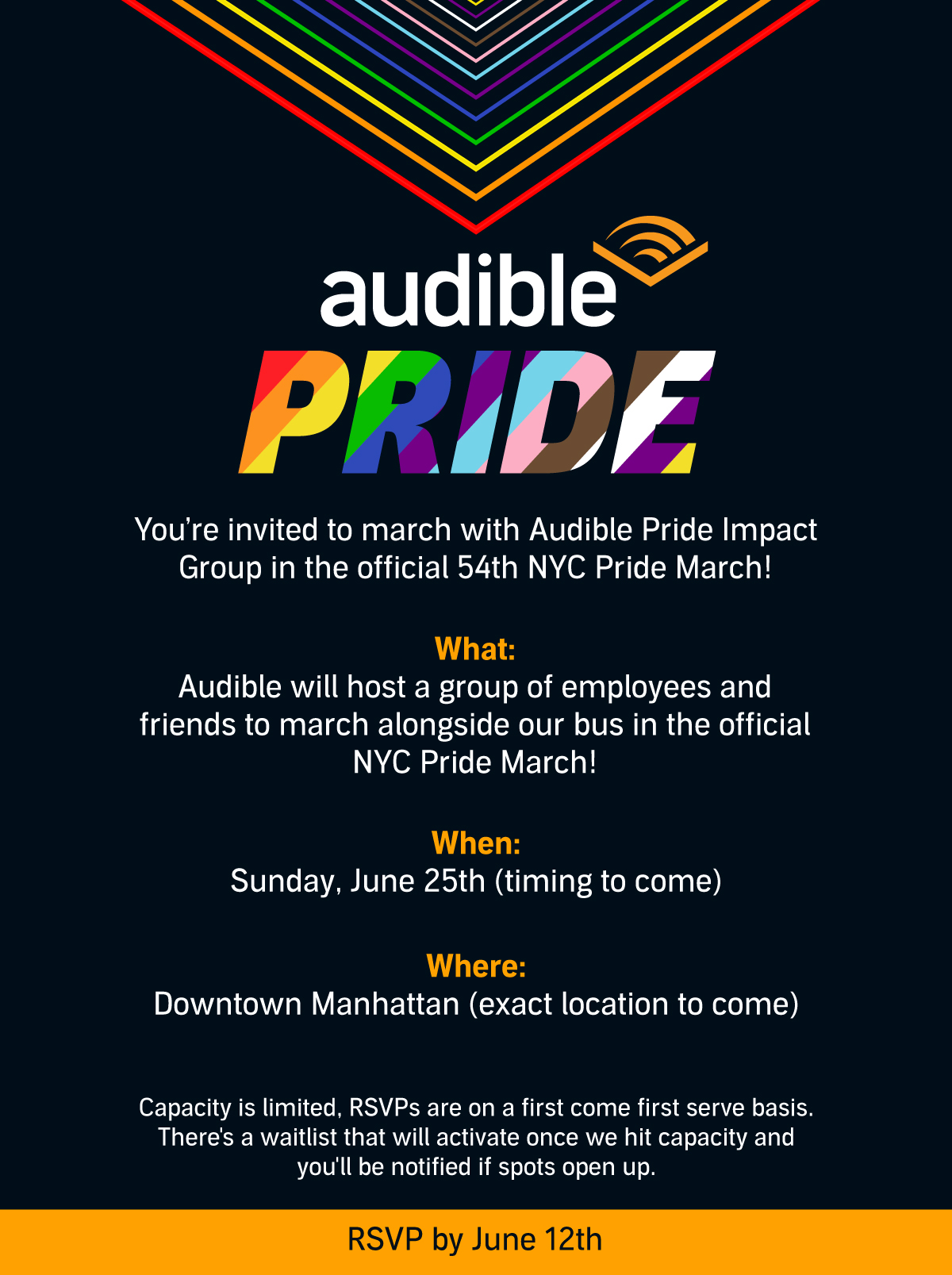 Create exciting digital and physical assets to help promote Audible's latest Pride content at the annual NYC Pride March for 2023, using the rainbow progress flag while observing the Audible brand guidelines.